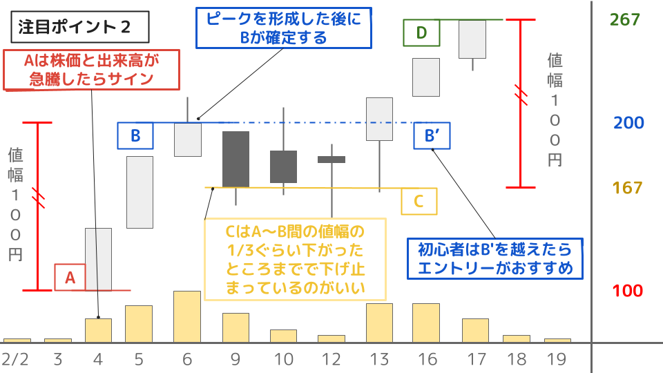 ・A地点から株価が一気に上昇、その後一旦陰線を付けて落ち着いた前日の終値をB地点とする