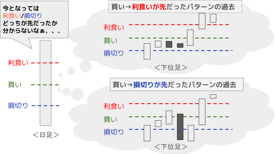 これを過去の動いていないローソク足(日足ベース)で判断する場合、「損切りになってから株価が順行したのか、利食いになってから株価が下がったのか」が分からないといった事象があります。